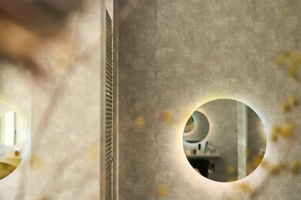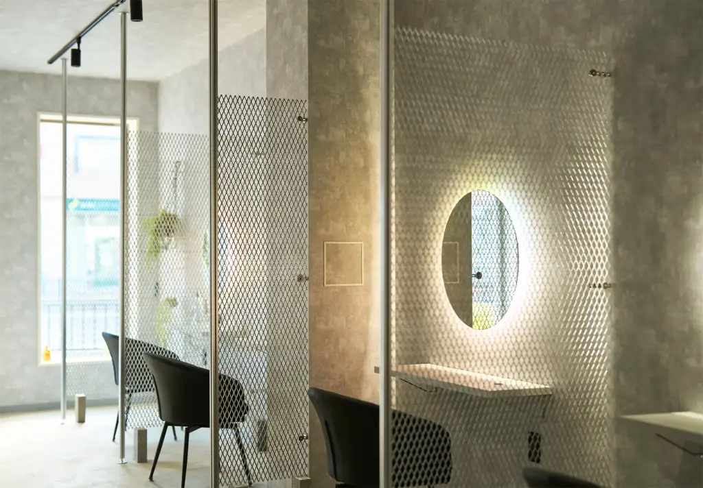 十人十色の個性がコンセプトの、壁面に設置した円形ミラーは光のスペクトルを纏い、柔らかな光でお客様の表情を自然に引き立てるライティングを設計しました。