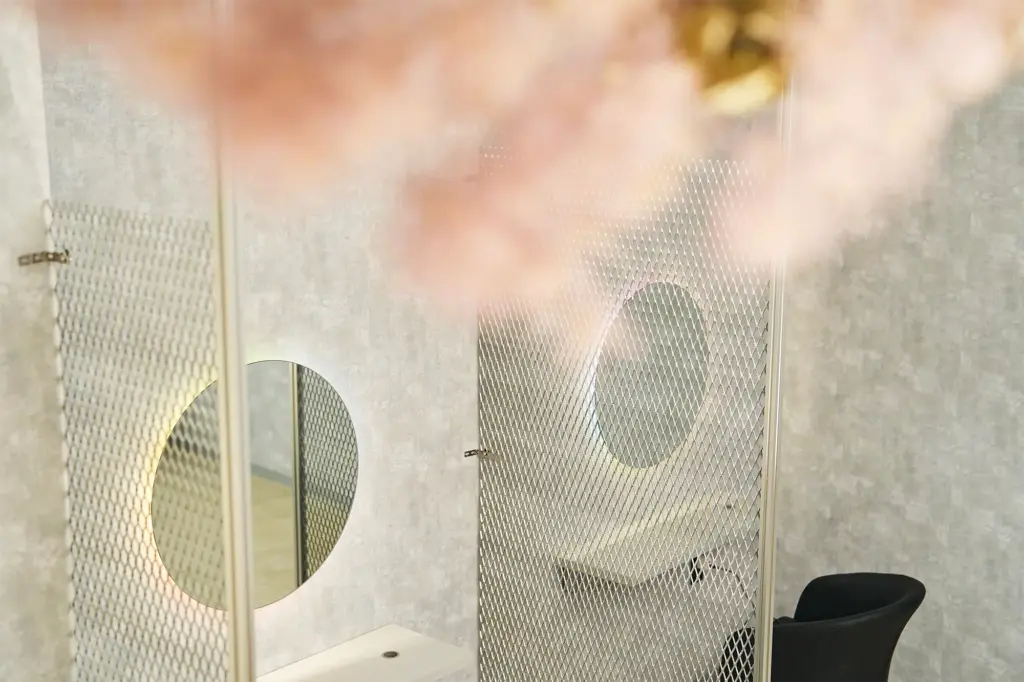 小規模な店舗で圧迫感が出る大きな原因のひとつは、視線が途中で止まりすぎることです。仕切りを増やせば安心感は出ますが、その分だけ閉塞感も強くなります。toiroでは、視線を遮るパーテーションに抜け感のあるエキスパンドメタルを採用し、プライベート感と開放感の両方を成り立たせています。完全に閉じるのではなく、ほどよく守られていると感じられること。この絶妙な距離感が、小さな空間でも心地よく見える理由です。