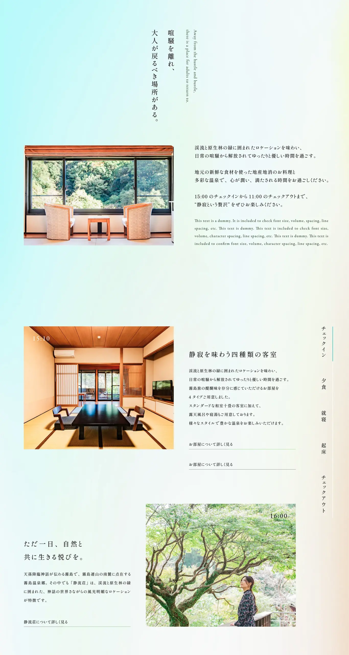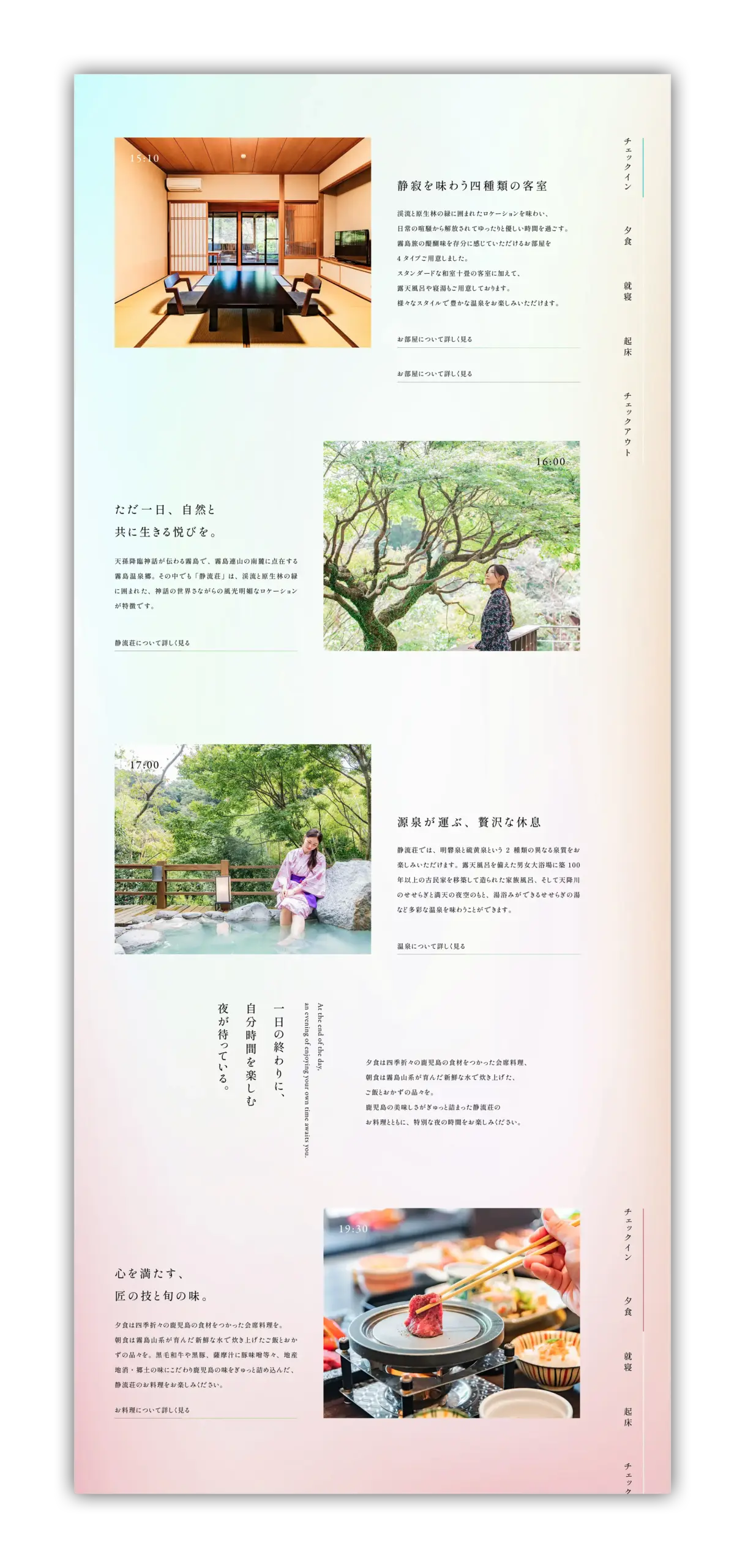 朝の光が差し込む露天風呂付きの客室、昼下がりに深呼吸する原生林に囲まれたテラス、夕暮れに染まる湯けむり、夜の静寂に包まれる時間──サーカディアンリズムの時間軸にそって、一日の移ろいとともに心が解かれていく感覚を表現。訪れる前から、その滞在の記憶が始まる“時間の旅”をオンライン上に描きました。