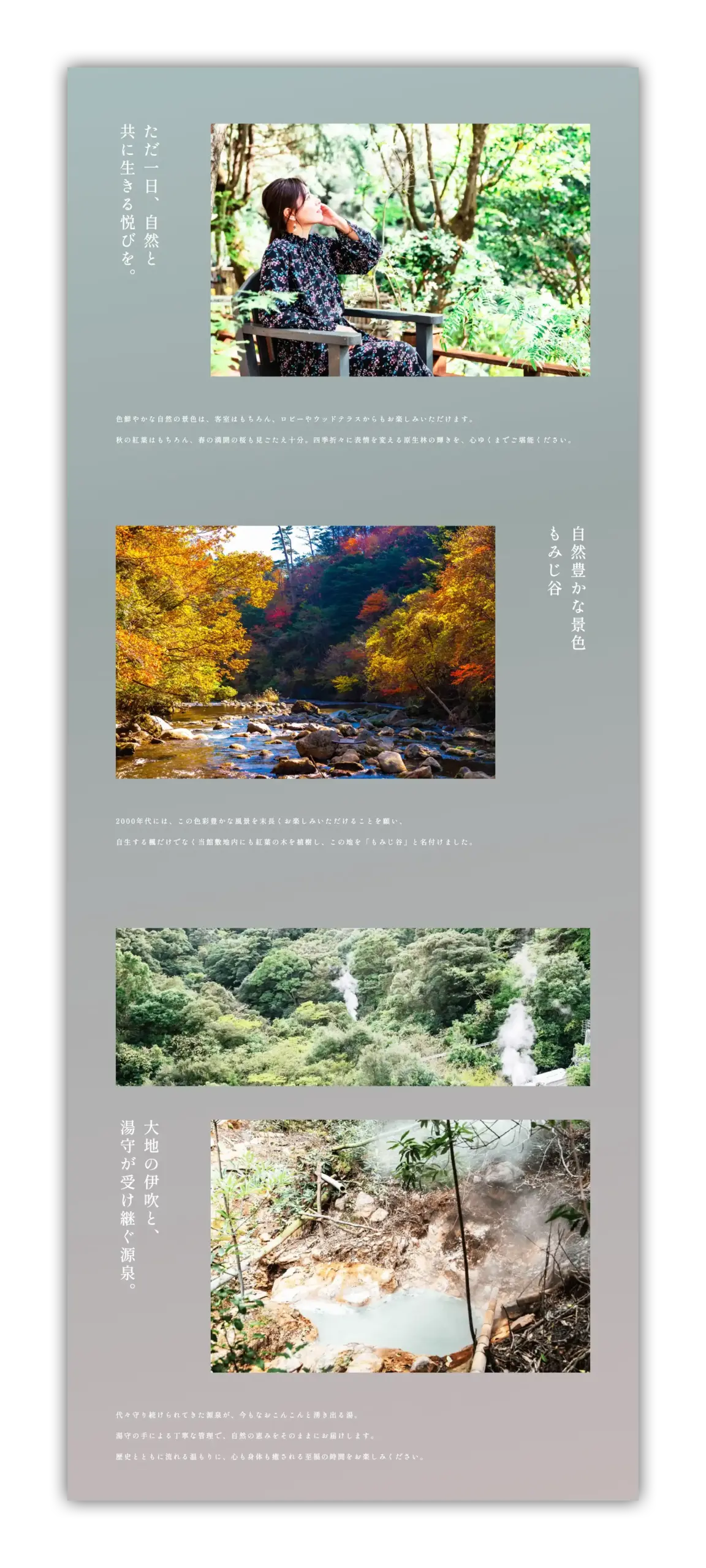 私たちが目指したのは、画面を開いた瞬間から始まる「最初の宿泊体験」。光や川のせせらぎ、湯気や時間の移ろいまでを丁寧に描き出すデザインで、WEBを「最初の宿泊体験」として設計。