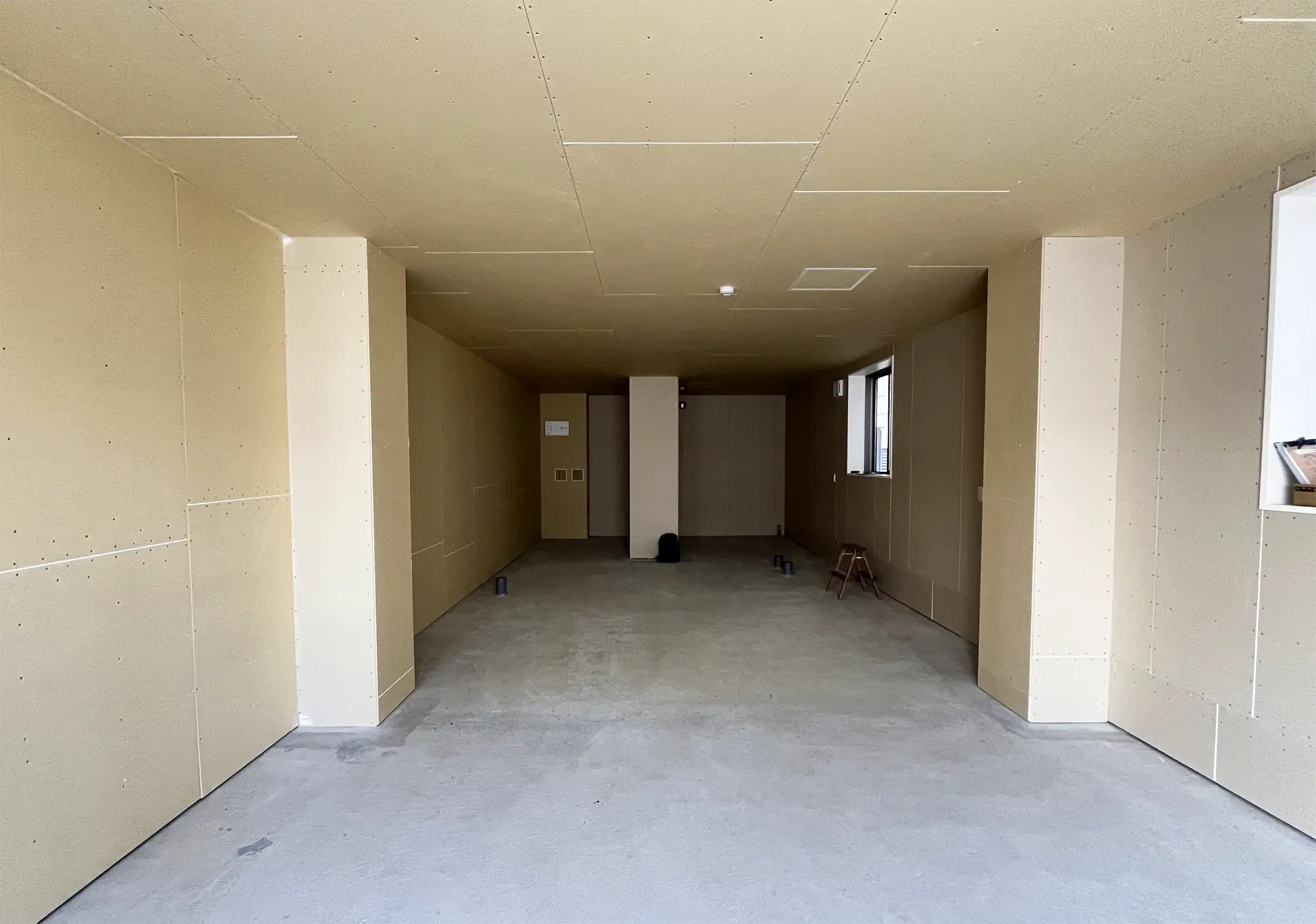 中央に据えた無垢のテーブルは、空間全体をゆるやかにつなぐ象徴的な存在。自然素材の質感が金属やコンクリートの無機質な要素と調和し、現代的でありながらも温かみを感じさせます。