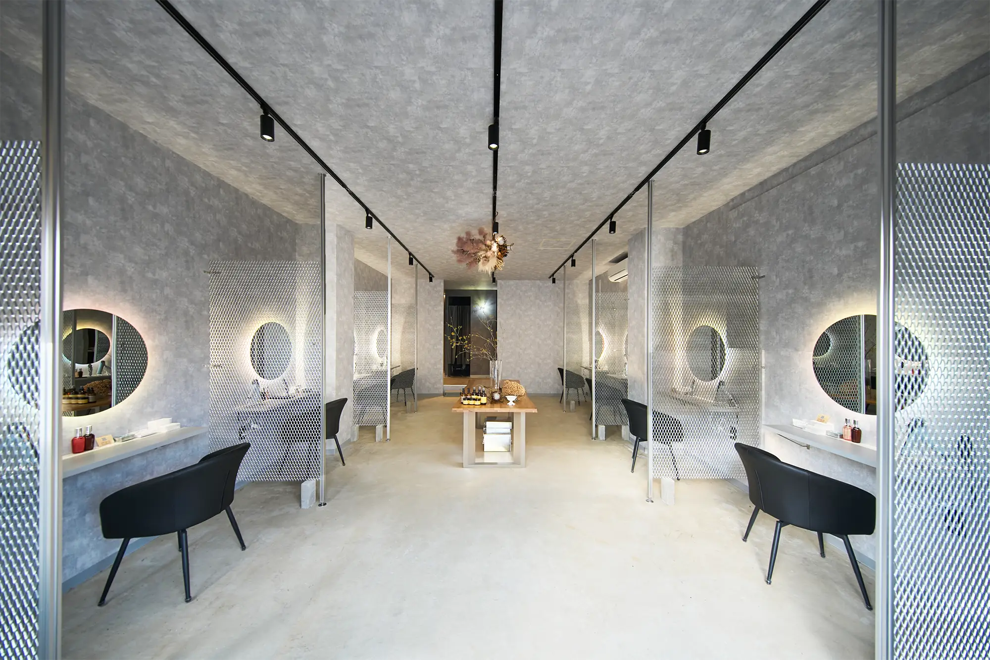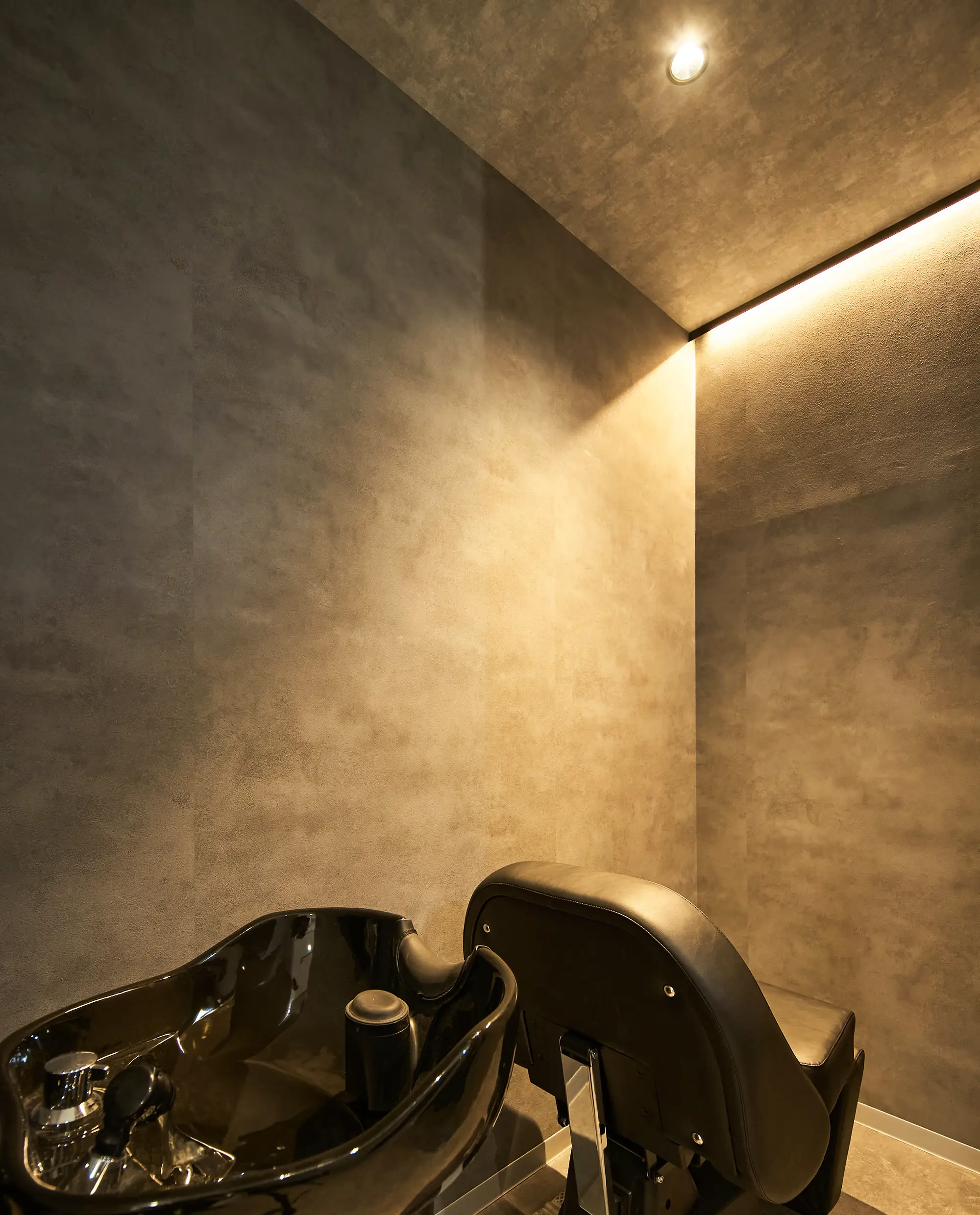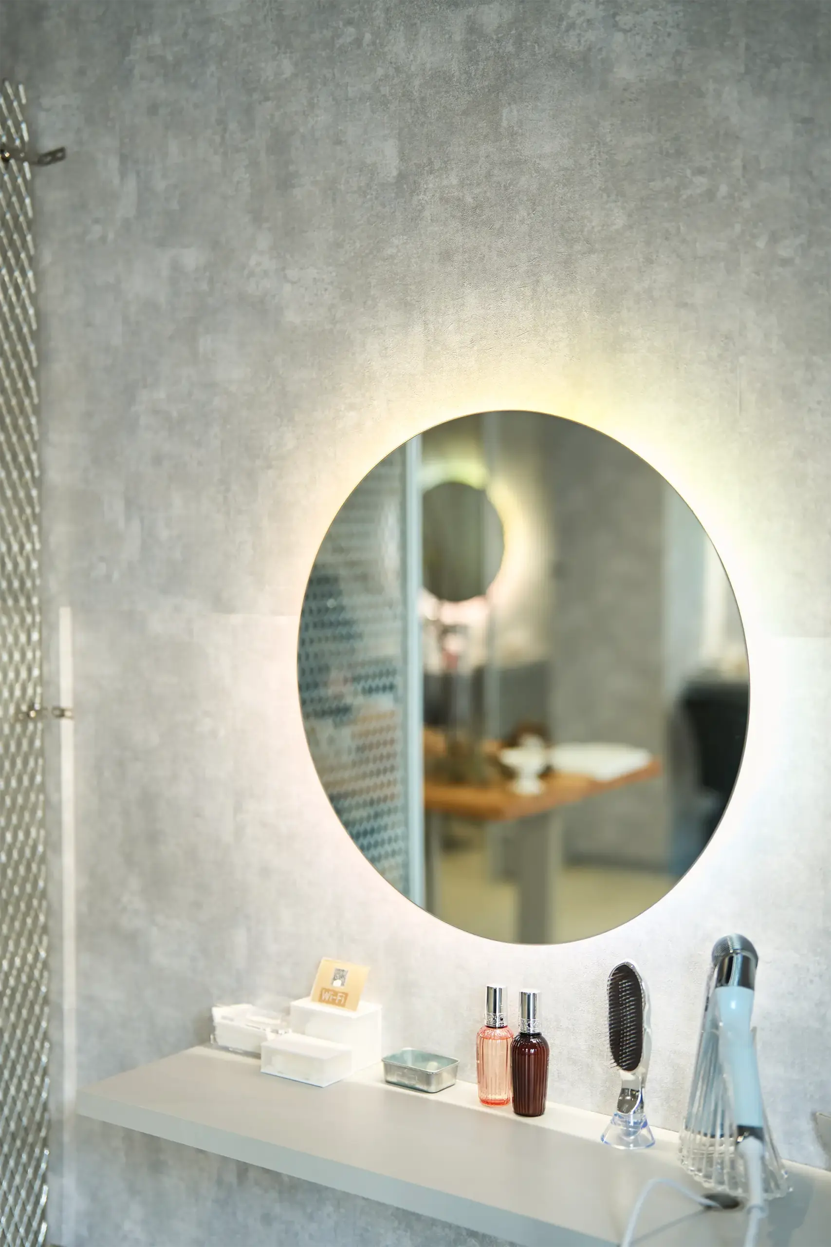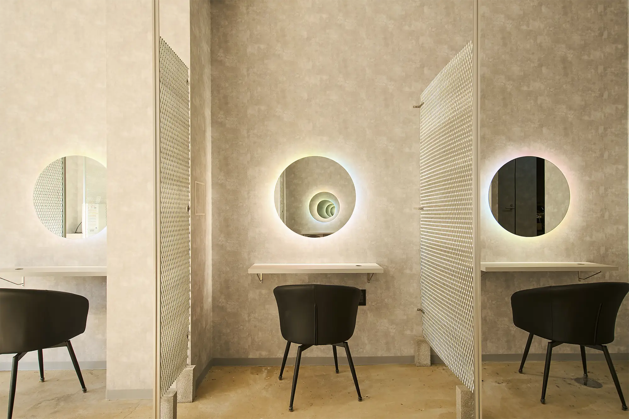 十人十色の個性を活かすをコンセプトに、壁面に設置した円形ミラーは光のスペクトルを纏い、柔らかな光でお客様の表情を自然に引き立てるライティングを設計。