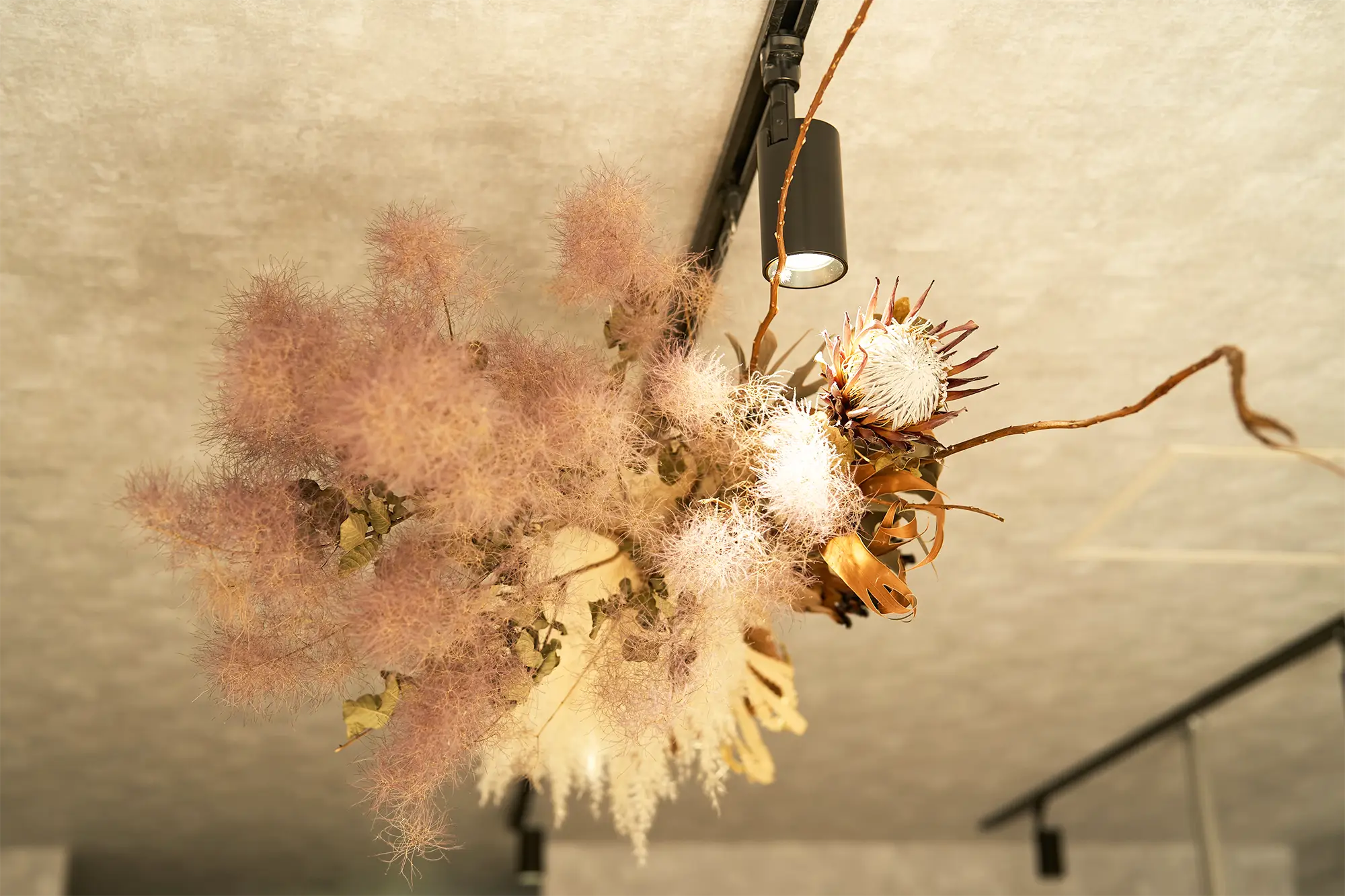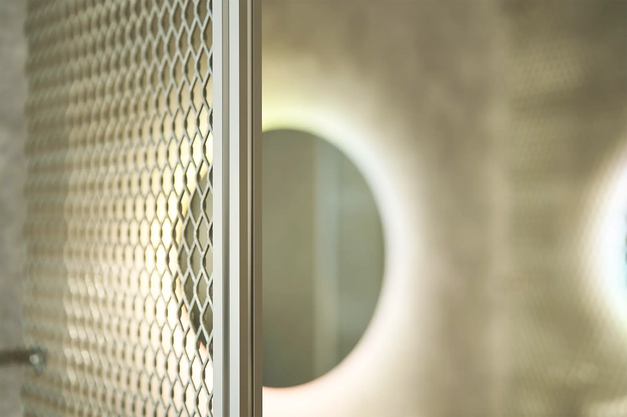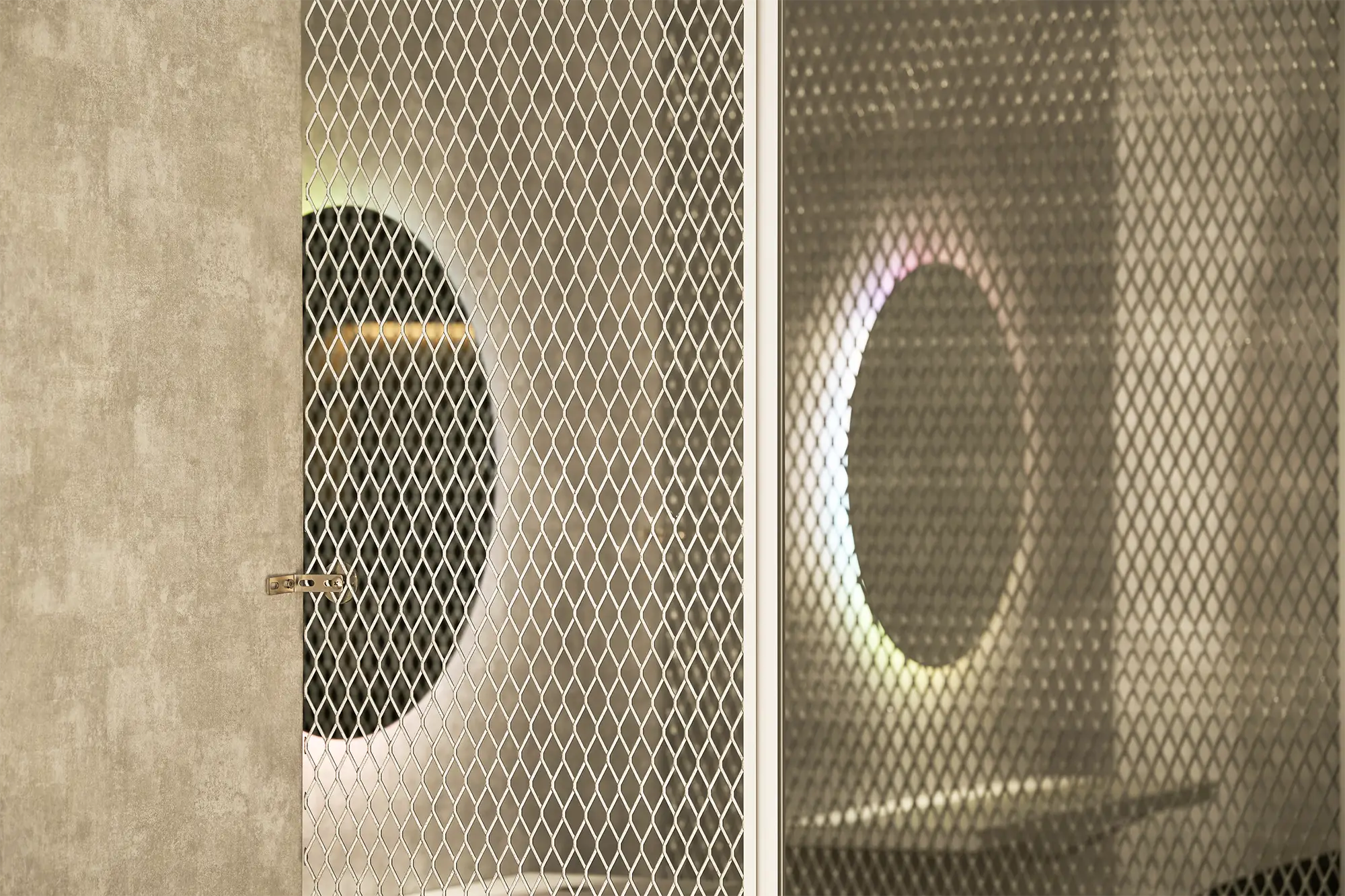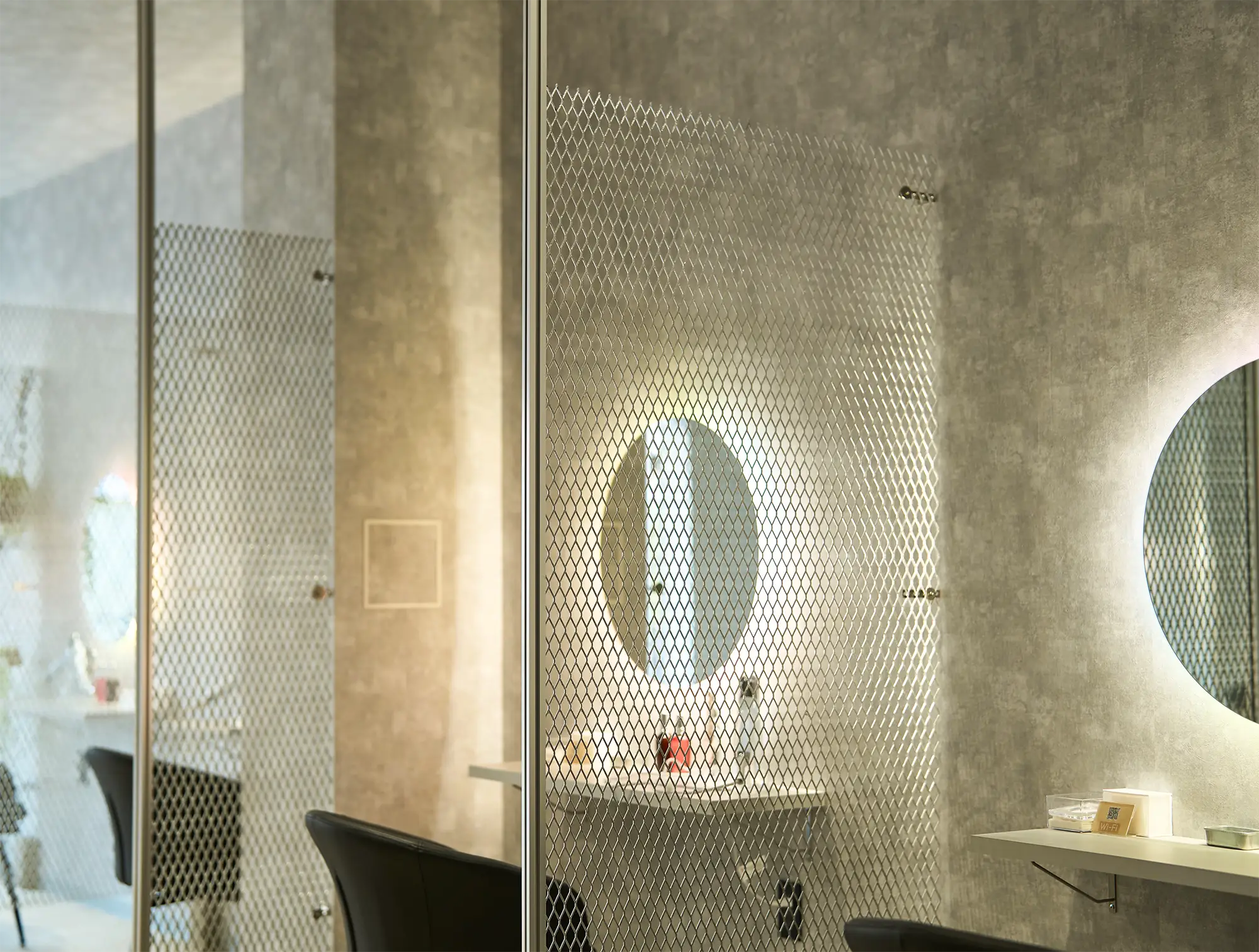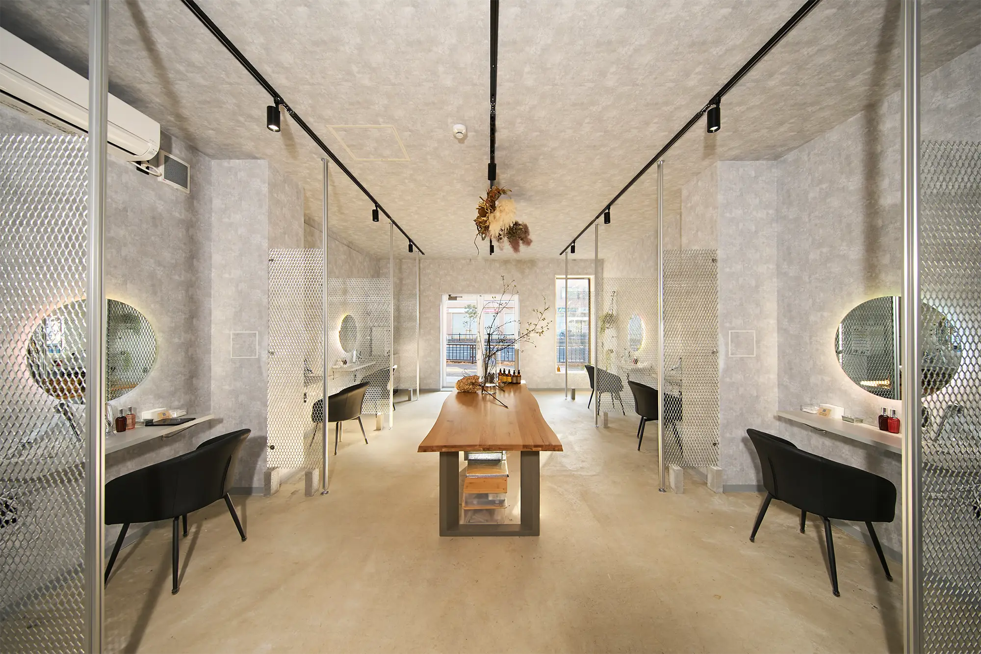 十人十色の個性を活かすをコンセプトに、壁面に設置した円形ミラーは光のスペクトルを纏い、柔らかな光でお客様の表情を自然に引き立てるライティングを設計。