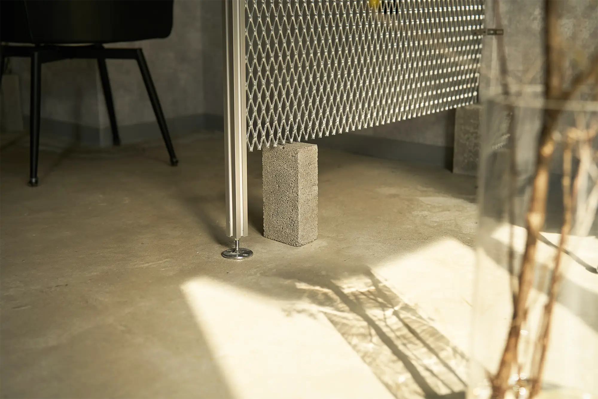 限られたスペースのため、視線を遮るパーテーションは抜け感のある素材(パンチングメタル)を採用することで、プライベート感と開放感を両立させています。