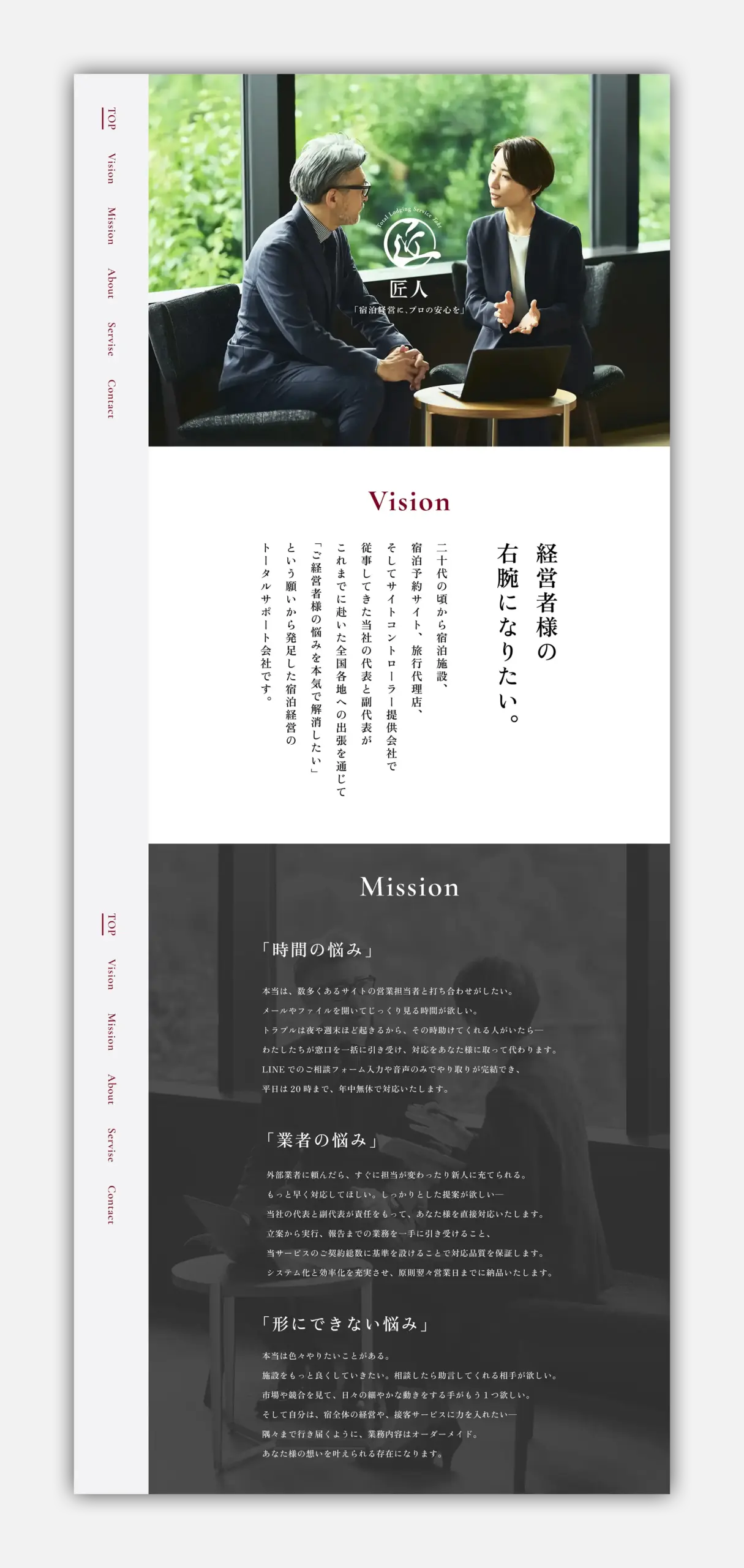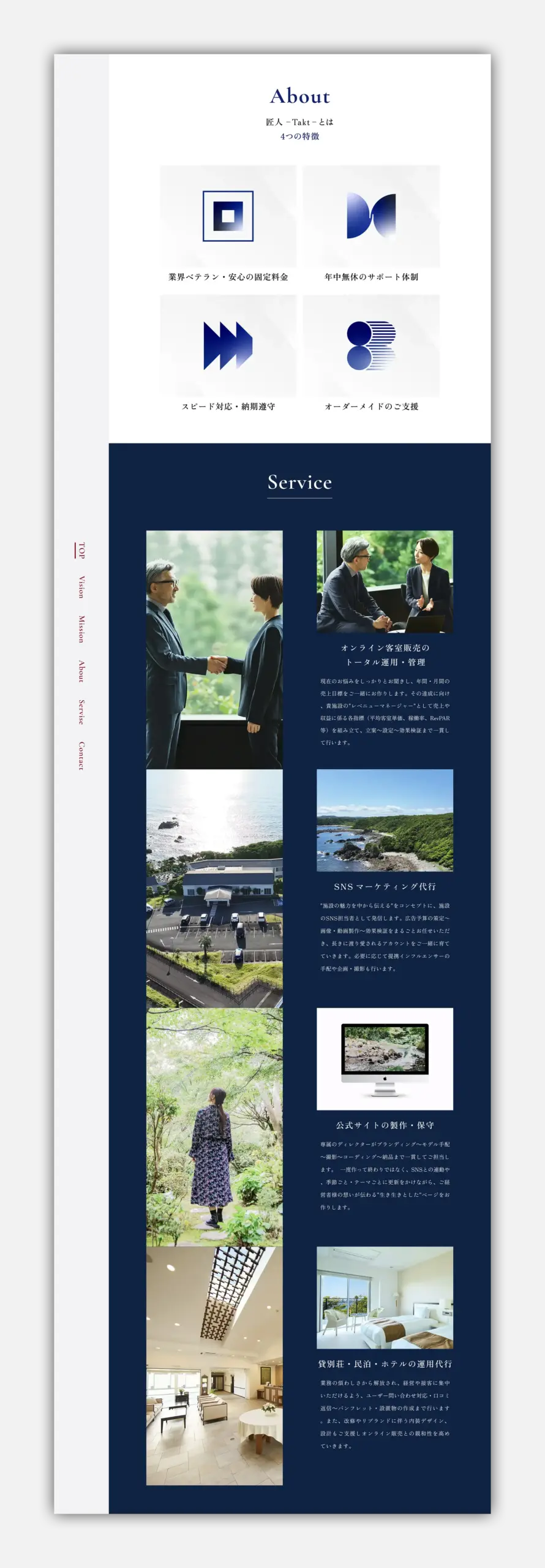 「匠人-Takt-」は、旅館・ホテル経営に特化したトータルサポートを行うサービスです。Rootforでは、その“専門性・信頼性・堅実性”を、Webサイト/ビジュアルアイデンティティーというかたちで具現化しました。